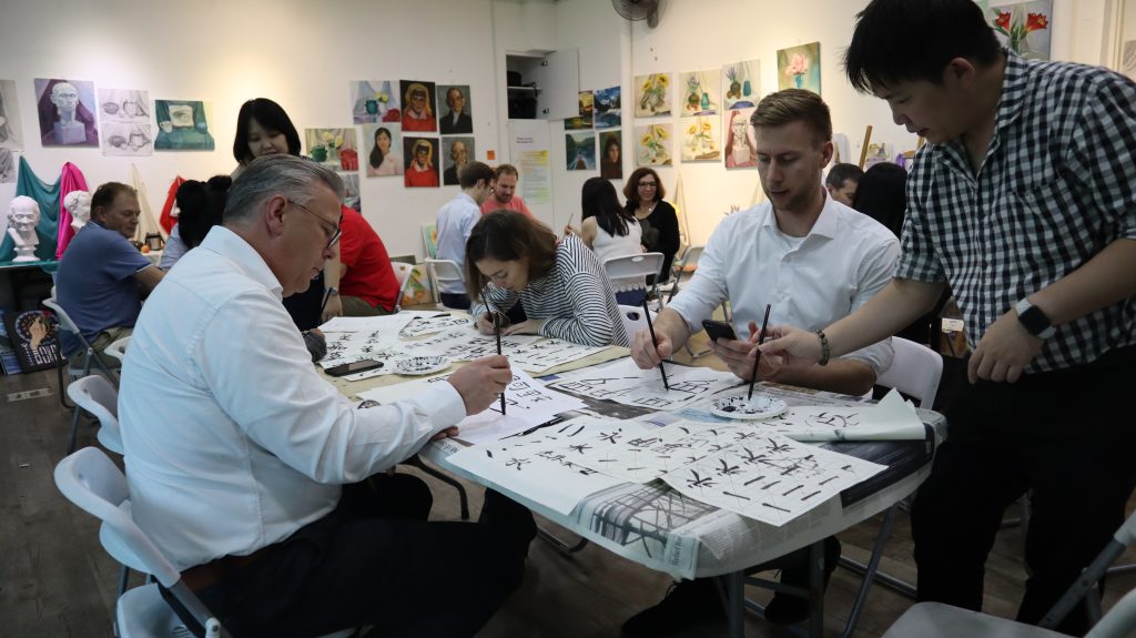 Participants are enjoying the learning of Chinese ink painting and this is a fun and new experience for teams! Learn painting together and work on a Fan painting to bring home or to decorate the office!